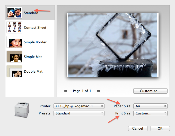 I'm using iPhoto 11, version 9.3.1. I was getting ready to print a photo, but decided to click on "Customize. . ." in the Print window just to see how the different borders would look around my photo. I didn't like any of the borders, but I couldn't find a way to get rid of any of the borders that I had added to my photo. Even when I canceled Print and then started from the beginning and selected the photo again and clicked on Print, the photo in the Print window didn't show up borderless, but had the last border I had selected in Print before cancelling. How do I remove the added border so I can print my photo borderless. Thanks.