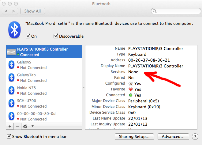 1.4 Finally add the controller to favorites and update services in Bluetooth Preferences / the sprocket pop-down menu. (Don't know what the update services does, but why not click it when you can??)