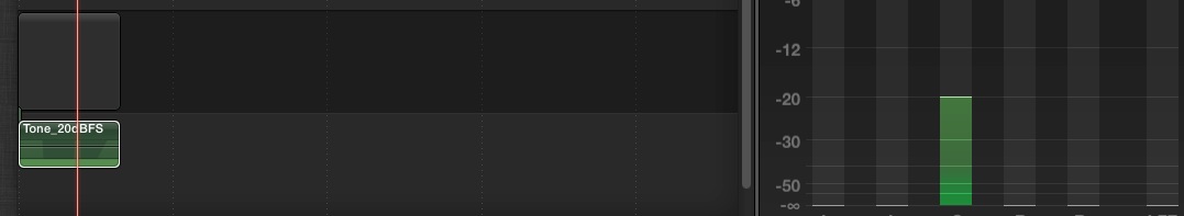 In FCP X, I import a mono (not stereo or dual-mono, just plain mono) reference tone at -20 dBFS. My project is set to surround (this is for multichannel projects).