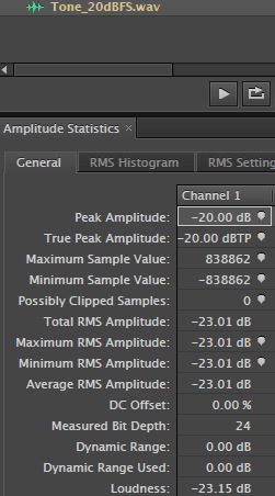 The imported tone is measured and confirmed to be at -20 dBFS on the Videotek, as well as in Audition CS6; straight from the file to eliminate any patch cord speculation: