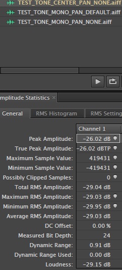 So last try: I set the channel configuration to CENTER and the PAN MODE to NONE. I get another file that is 6.02 dB quieter.