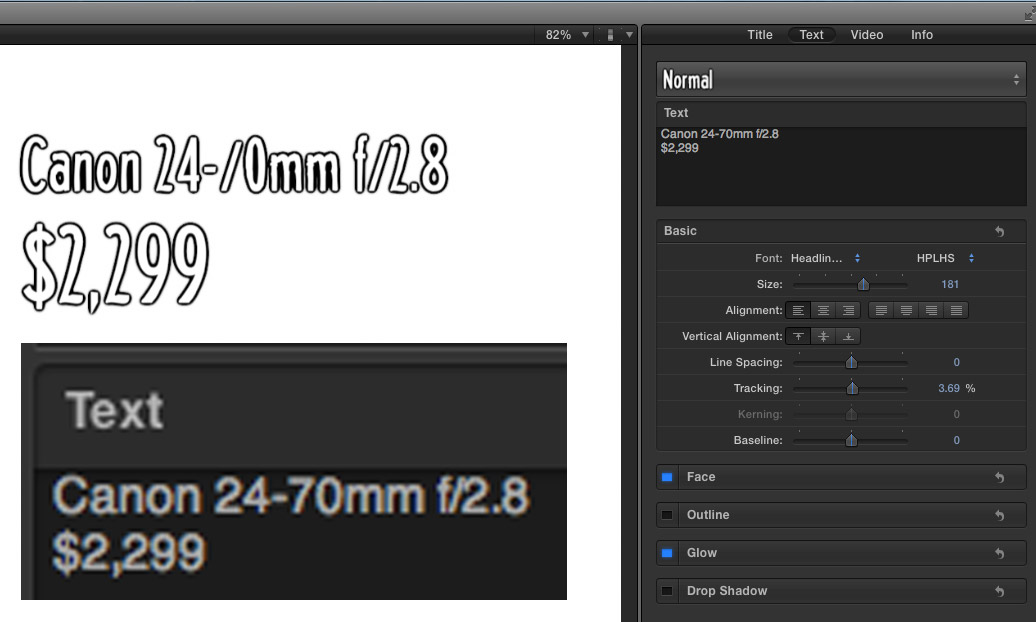 This has been happening occassionally (since I updated to FCPX 10.0.6): Notice how the rendered text says "Canon 24-/0," but the source text says "Canon 24-70"? Often FCPX transposes 7 with /, or sometimes it's opposite: an intentional / is replaced by 7. Weird, and maddening. It always looks correct in the monitor before render. Even if I force a re-render, no fix.