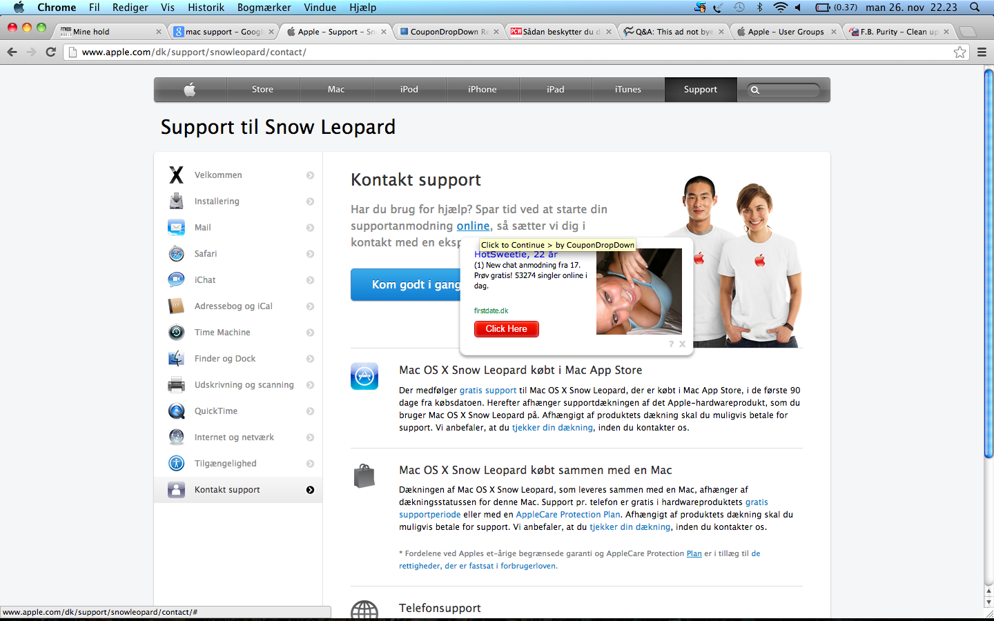 For a few days i've been having this problem with pop-up ads on every site i visit. Here is a example of the ad on an apple.com page.