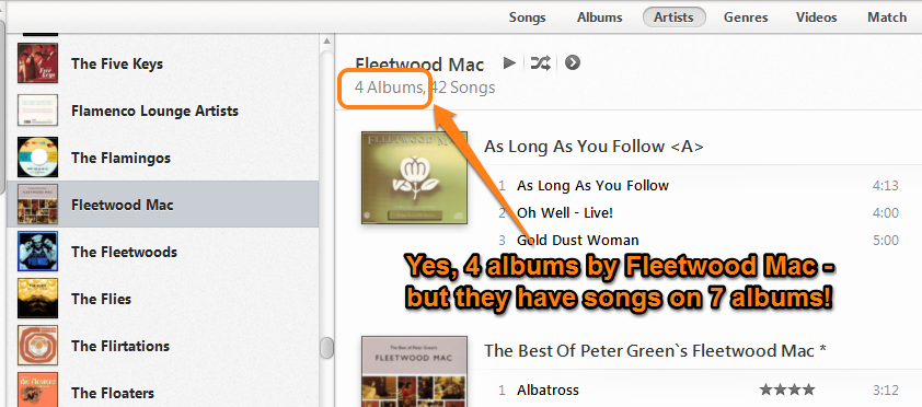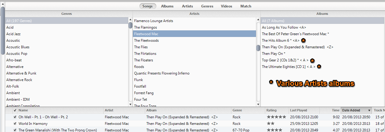 Until now, iTunes regarded a Compilation Album as one with multiple artists, but the music industry and consequently a lot of the entries on Gracenote regarded an album by a single artist - but with songs from various stages of their career - as a compilation. Looking at the Artist list in iTunes, there was no entry for "Various Artists", and albums were instead listed under "Compilations". This has meant for example, that not only was "Now XX listed under Compilations, but so too was "The Whole Story" by Kate Bush (a compilation of her earlier work). If that was the only album of hers in my Library, her name would not be listed in the Artists section. I also found it necessary to fill in the Album Artist field on Compilation albums with "Various Artist".