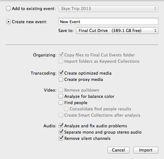 Here are a couple of screen grabs showing the import window and the import preferenced window when I hit the Import all Button. I wait until and the optomised media has been created before trying to eject the card but only way I have found to eject is to close FCP and eject via the desktop.