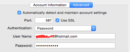 Had same problem - i fixed it by doing the following. Goto mail preferences - hotmail account - check outgoing Mail Server (SMTP) - Edit SMTP server list - choose the hotmail account - make sure you are using port 587 and "Use SSL" is ticked. For Authentication - choose - External (TLS Client Certification) - this will require you to enter hotmail address and password. On the Account information tab - I also used the apple certificate for the TLS Certificate - I did not leave this as "None". Good luck.