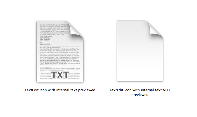 Half my TextEdit documents have the "internal text previewed" custom-icon style, and the other half have the "generic blank white TextEdit icon" style, and I can't figure out why and/or how to permanently change some kind of setting to make all future ones be consistently the same.