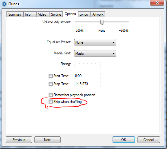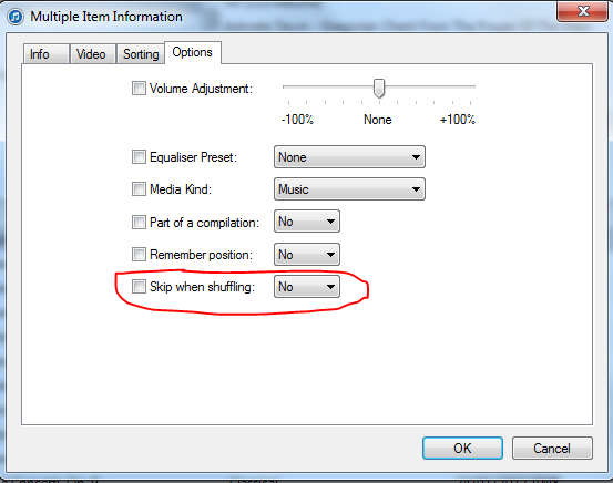 If you choose several items at the same time, the skip when shuflfing changes to this: