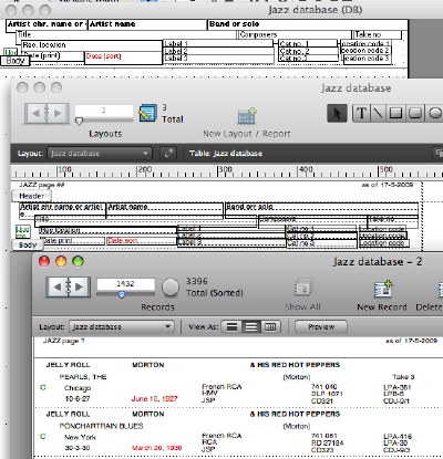 The AW database is remarkably powerful. It's not a relational database like Filemaker Pro, but you can get some of the same functionality by the use of layouts, so that though all the fields are in the one database different layouts show only some of them. Almost the first thing I did when I bought my first Mac in 1993 was to create a database of my jazz records (insanely ambitious for a newbie) which I subsequently recreated in FMPro (picture, right). It had I suppose around two thousand entries then - by now there are 3,755 (including alternative takes). In those days I printed it for references, so I used sliding fields to produce a tidy print version.It's a tribute to AW that I was able to work all that out at that stage (it was quite a bit more difficult with FMPro but I was a lot more experienced by then). I gave up the print version some years ago, it was getting unmanageable thick.