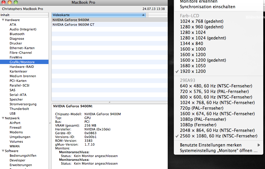 Is there any way to make MBP 17 (Intel HD and nVidia GT graphics, SnowLeo) or MBA 13 (Mountain Lion) display 2560x1080 on external monitor (LG 29" ultrawide)? My MacPro with RadeonX1900 card (10.5.8) does it perfectly but I cannot find a way to get the laptops to do it. Tried res. switching apps, still no good. Thanks.