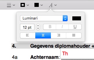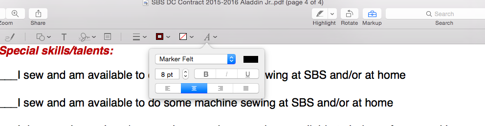 Placing the cursor into an empty field automatically opens a text box on the field. The "A" button on the Markup toolbar opens a little font menu popup, but it doesn't do anything. I can change it to whatever I want, but the text in the field with my cursor remains small, blue and Helvetica.