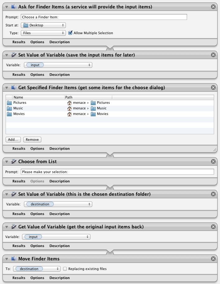 So, the end result is to make this a service, but I don't care if I have to make this in applescript first. The result is to be able to select a number of files and have the service prompt me to choose between moving between Specific folders.