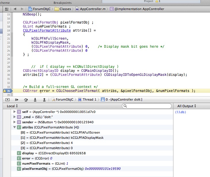 CGLPixelFormatObj pixelFormatObj ;GLint numPixelFormats ;CGLPixelFormatAttribute attribs[]={ kCGLPFAFullScreen, kCGLPFADisplayMask, (CGLPixelFormatAttribute)0, /* Display mask bit goes here */ (CGLPixelFormatAttribute)0};if( display == kCGNullDirectDisplay ) display =CGMainDisplayID();attribs[2]=(CGLPixelFormatAttribute)CGDisplayIDToOpenGLDisplayMask(display);/* Build a full-screen GL context */CGError error =CGLChoosePixelFormat( attribs,&pixelFormatObj,&numPixelFormats );if( pixelFormatObj == NULL ) return NULL;