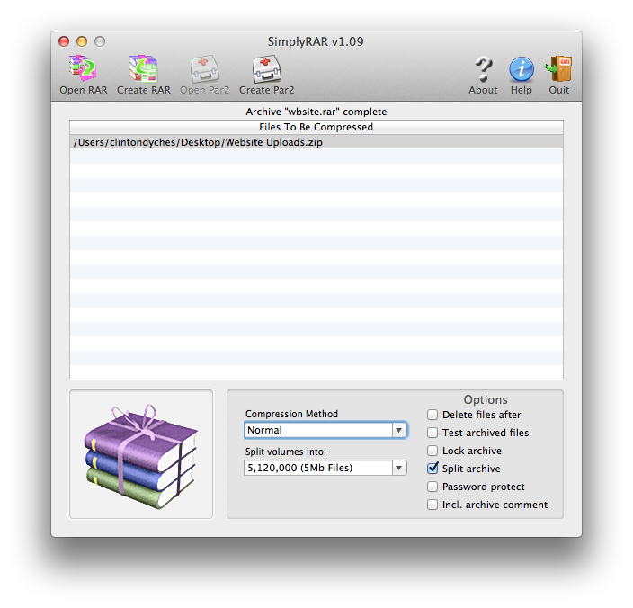 In it, I've a zip file and have elected to split the archive into 5MB files. The person that you send the files to would need a program to read the split RAR files and open RAR files. On the Mac, this can be accomplished with the free "The Unarchiver" from the App Store. If the other person is running Windows, there are dozens of free unarchiving apps that can handle RAR segemented files.