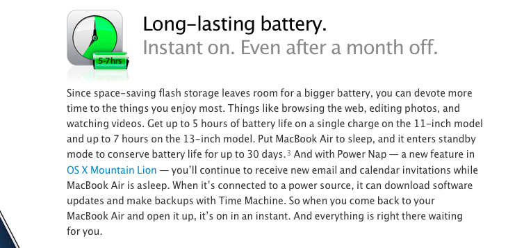 I just bought my Macbook AIr Mid 2012, 13 inch, i5, 128 gb, 4gb ram, and i've had it for about 4-5 days now, i bought it refurbished, i now noticed that the battery life is suppose to be 7 hours, i'll get from 2-5, i do gaming, i play Team Fortress 2 and Minecraft, i know that when i play these games i get 2-3 hours, but when im just listen to music and broswing the web i get 3-5 which isnt normal, i know for a fact that this computer is suppose to do atleast 6-7 hours, I beileve its Mountain Lion, i've read that Mountain Lion, has battery problems with the air and the pro, i've also read that the battery should be charged to 100% when i got it, but i didnt, it was at 70% when i got it and i didnt charge it till the updates, im going to discharge the battery to 0% and leave it over night to charge, i've read that this will fix the problem, i've also reset the SMC. Has anyone had past, expirence?