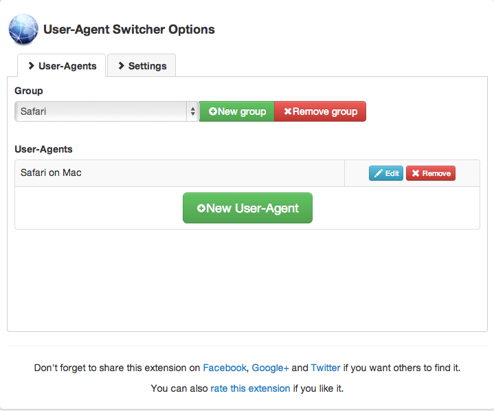 On the "User-Agents" tab, change the "Group" setting to "Safari"...