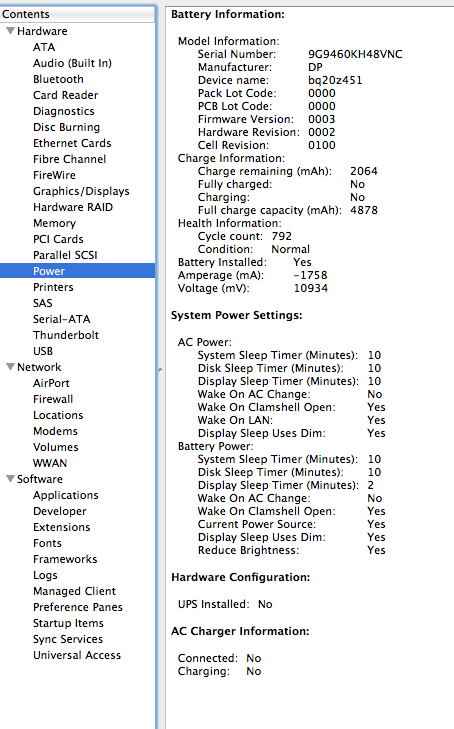 My macbook pro 10.6.8 shuts down randomly. This has been happening for the past 1 week. I thought it happens when my Mac gets hot or when I am watching a video and the fan works loudly. It happens despite having more than 50% charge. However today it happened even though there 88% charge and the Mac was not hot at all and I was not even working on it, it was just switched on and then suddenly it shut down. Here is my power report: