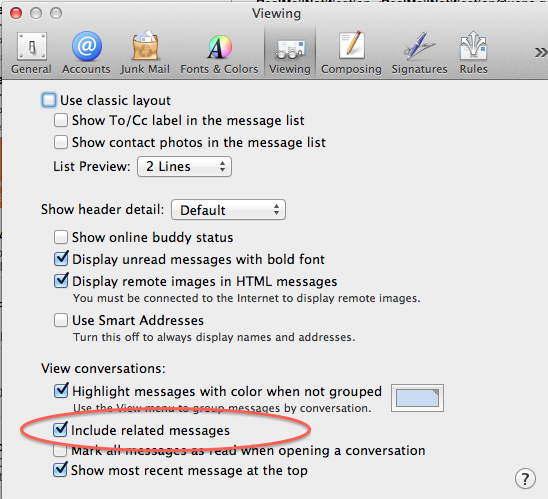 That checkbox is checked, I have to go to View/Expand All Conversations about 20-30 times a day to expand all messages because it continues to collapse whenever I "switch views" meaning, going from one folder, to a keyword search, to a smart folder, etc. It would be great to have some command line "defaults...xxxxx" that sets the "Expand All Conversations" default to on rather than persistent off - even if selected from the menu.