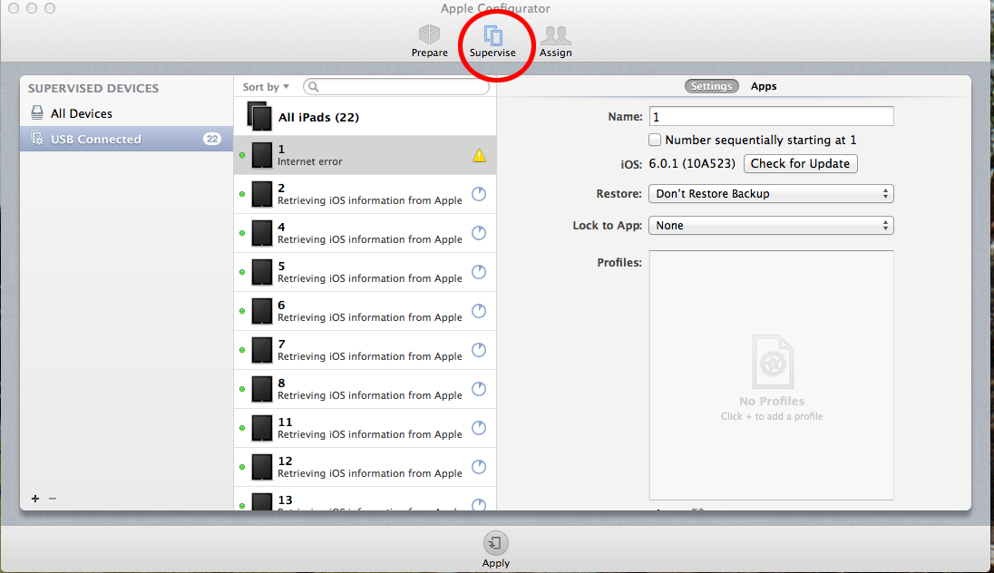 But when I connect one of them and open Xcode, I get a error "Operation prohibited on supervised devices"