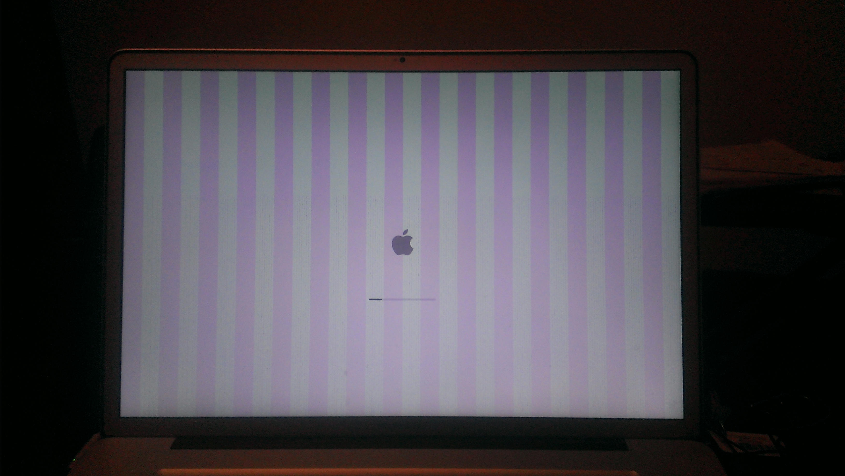 I have a MacBook Pro (17-inch, Late 2011) with an AMD Radeon HD 6770M (1024 MB). While using Photoshop CS6 (specifically the masking brush tool), my screen started to distort (like a repeating effect on the edge), everything froze / went black and I had to do a hard restart. Then I got some some purple / green vertical lines at the start up screen (see pic below).
