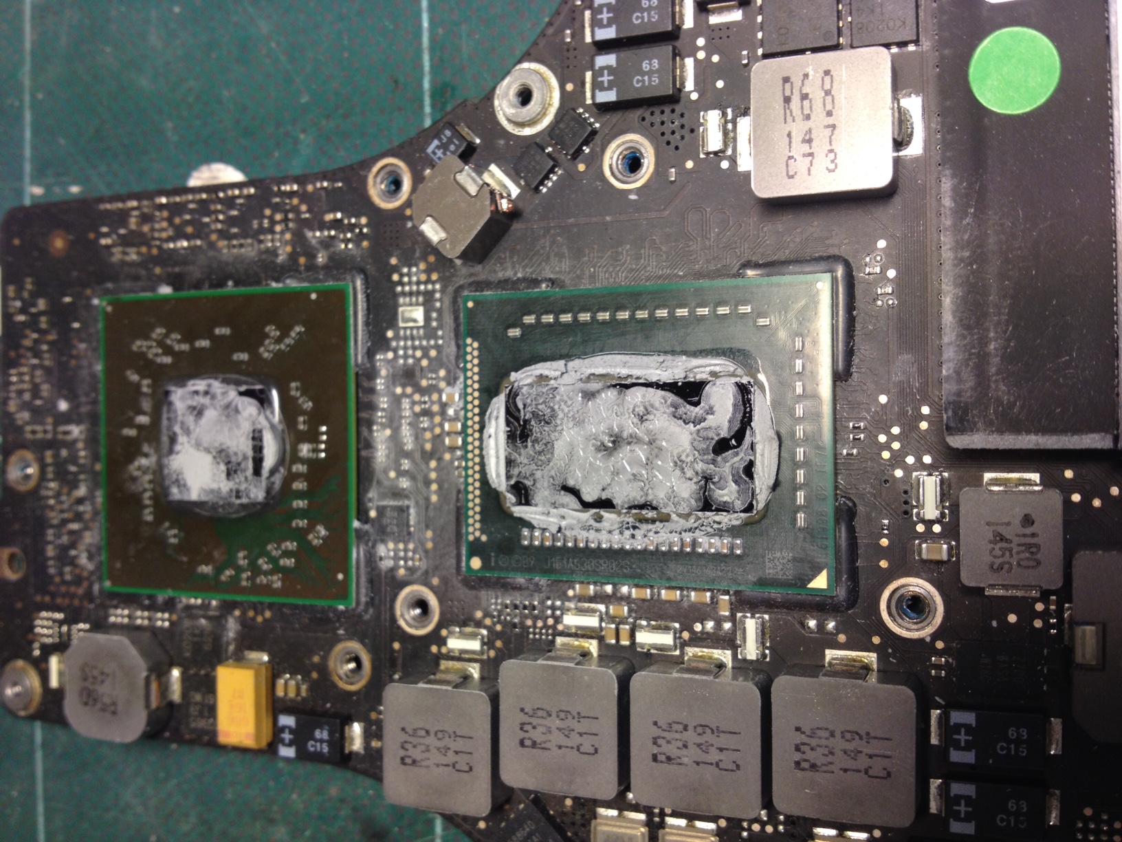 Below the pic of the old paste on the replacement logic board. As you can see, the gray paste is not evenly spread out on the chips.