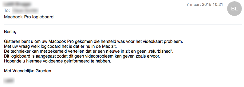 Gisteren bent u om uw Macbook Pro gekomen die hersteld was voor het videokaart probleem.