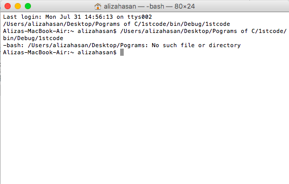 Executing: osascript -e 'tell app "Terminal"' -e 'activate' -e 'do script "/Users/alyssacastelli/Desktop/C Programming Files/alyssahello"' -e 'end tell' /Users/alyssacastelli/Downloads/CodeBlocks.app/Contents/MacOS/cb_console_runner (in /Users/alyssacastelli/Desktop/C Programming Files)