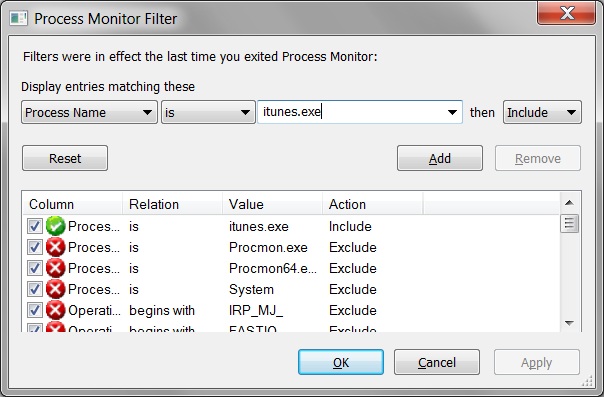 The left hand field starts off as architcture, you use the drop down arrow to find process name, then type iTunes.exe as shown.