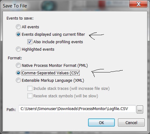 Click on Ok and the file will be saved in the same folder as procmon and will be called logfile.csv.
