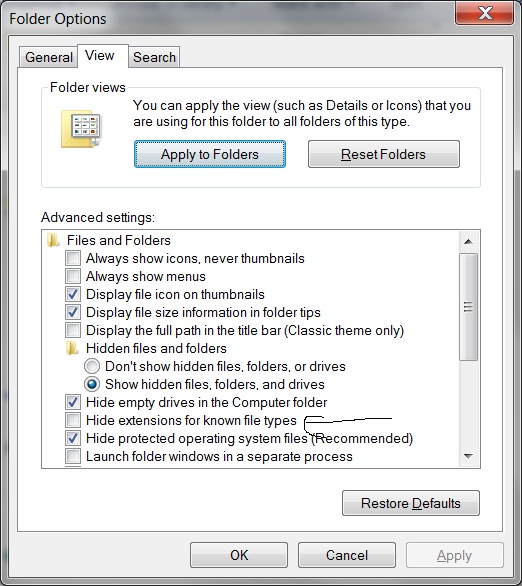 Click on Organize (top left) and select "Folder and search options". Then click on the view tab.