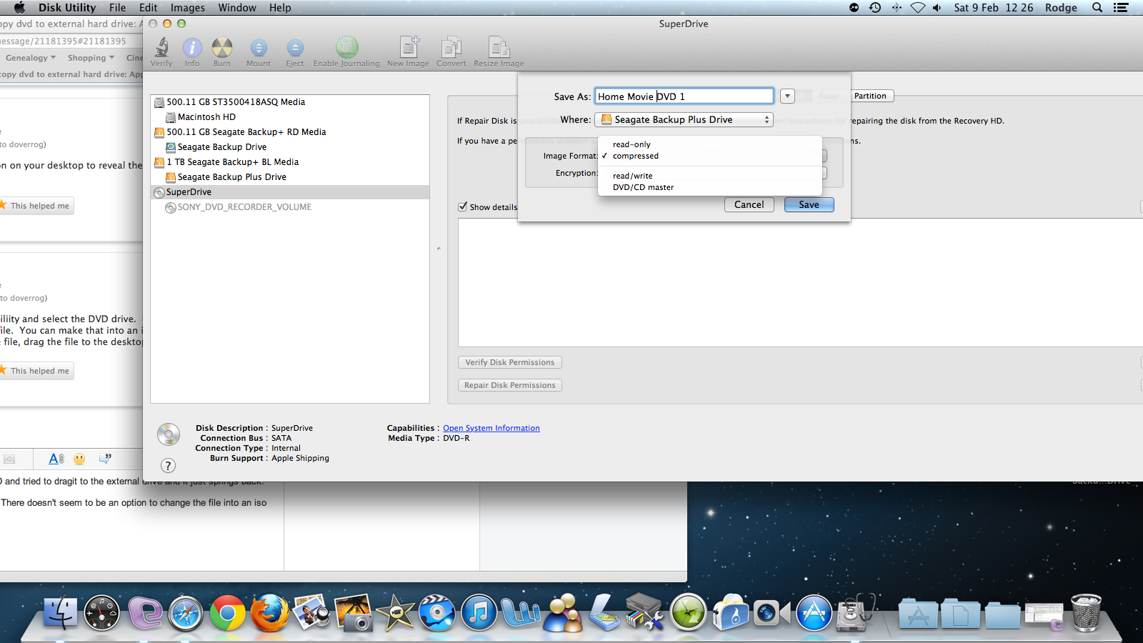 I then opened disc utility, selected Superdrive. There doesn't seem to be an option to change the file into an iso (I'm afraid I don't understand the term). The image format offers me read-only, compressed, read/write or DVD/CD Master. I've tried all 4 and get an error message -61 which seems to mean it doesn't like the dmg fomat?