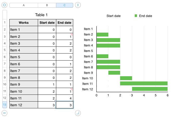 Some detail (in case if don't understand comments inside the file): in case your stage starts from first day and its duration is one or two or more days/months/minutes etc just put in "Start date" 0 and in "End date" number according to duration; in case if your stage starts in middle just put in "Start date" number of starting day/month/minute etc and add exact days/months/minutes etc to get correct indication in the chart: for example, if my stage starts in ninth month and will finish in twelve month, I put 9 in "Start date" and 3 in "End date".