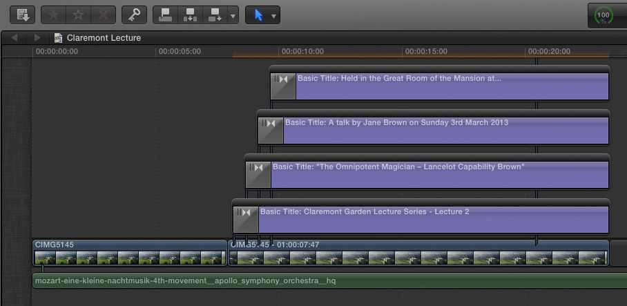 My current project is a 55 minute 1080p 25fps AVCHD video from our Panasonic X900 camcorder, and I just added a single title with a cross dissolve at the beginning, and a cross dissolve to fade out at the end.