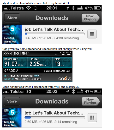 If I disable WFI and head over to 3G/LTE everything is better, back to any WIFI network and it's advising me approx 1 hour to download the ~50MB audio version of the podcast. Oddly I don't have this issue with the Video vergecast, it downloads solidly over WIFI or 3G/LTE.