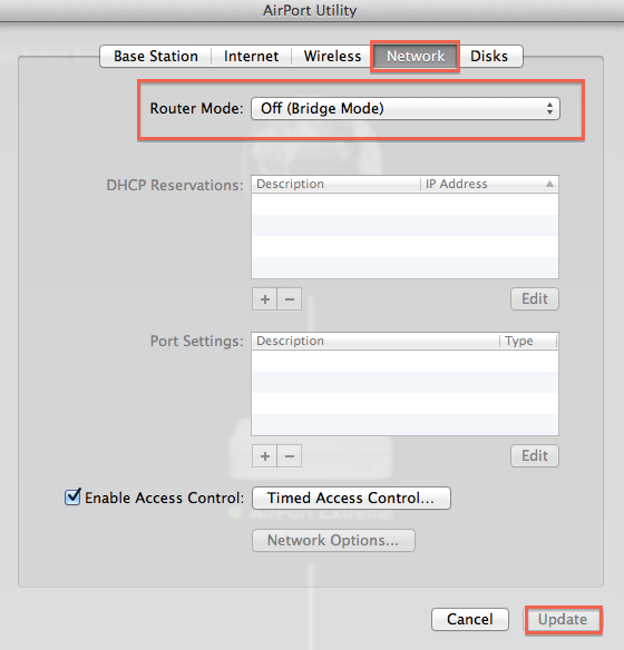 Click Update at the lower right of the window and the AirPort will restart in 30 seconds.
