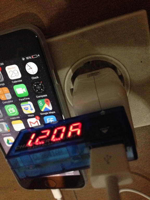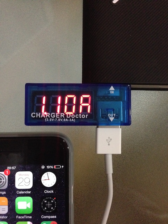 Well, one of our gauges may be off, but below 20% mine shows 1.5 A into an iPhone 6 using an iPad 12 W adapter, and 1.0 using the Apple cube. And it shows 1.0 charging a 4S (which is correct). It shows 2.1 amps into an iPad.