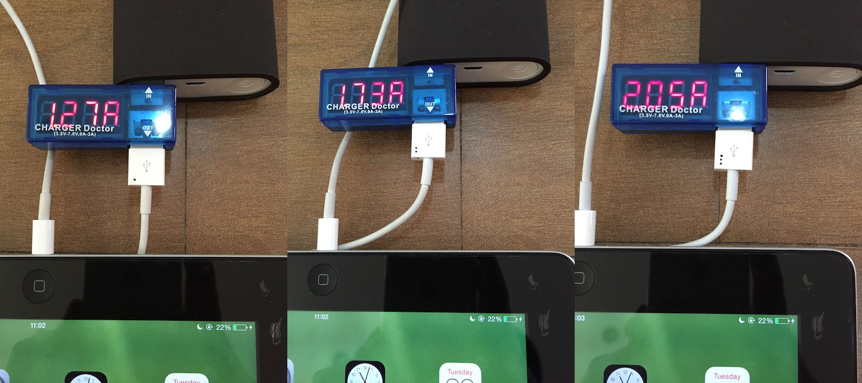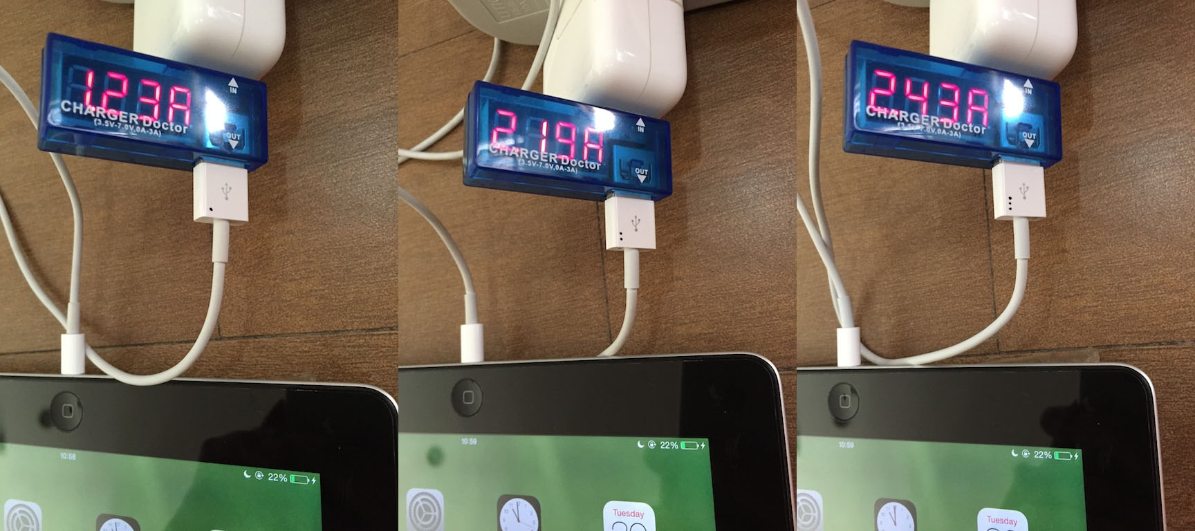 1) iPad 4 charger test. Apparently the "1A-rated" cable wasn't as bad as it was, now consistently showing 1.2A-ish current while charging the iPad. Maybe the initial test had something to do with the remaining charge left in the iPad at that time. The cable with three dots does shows the blazing fast 2.4A-ish current.