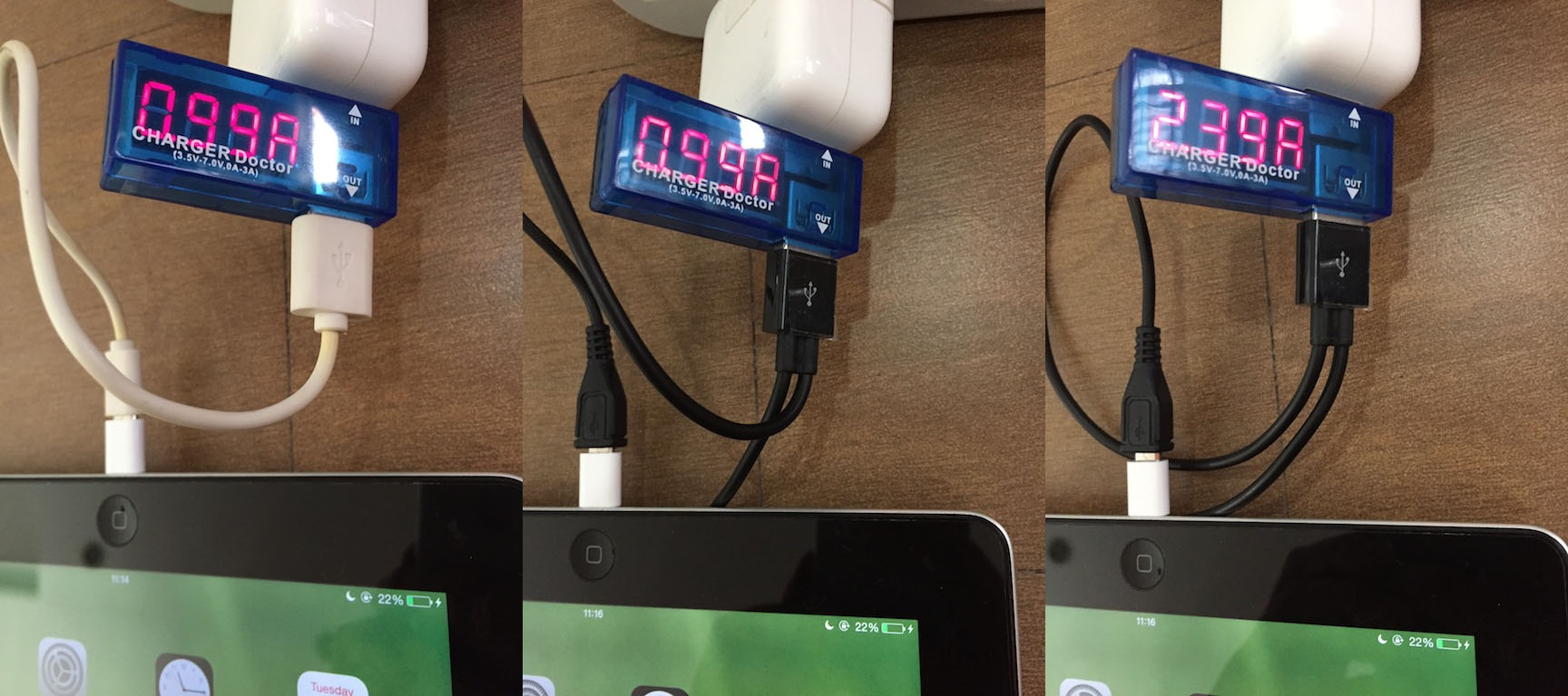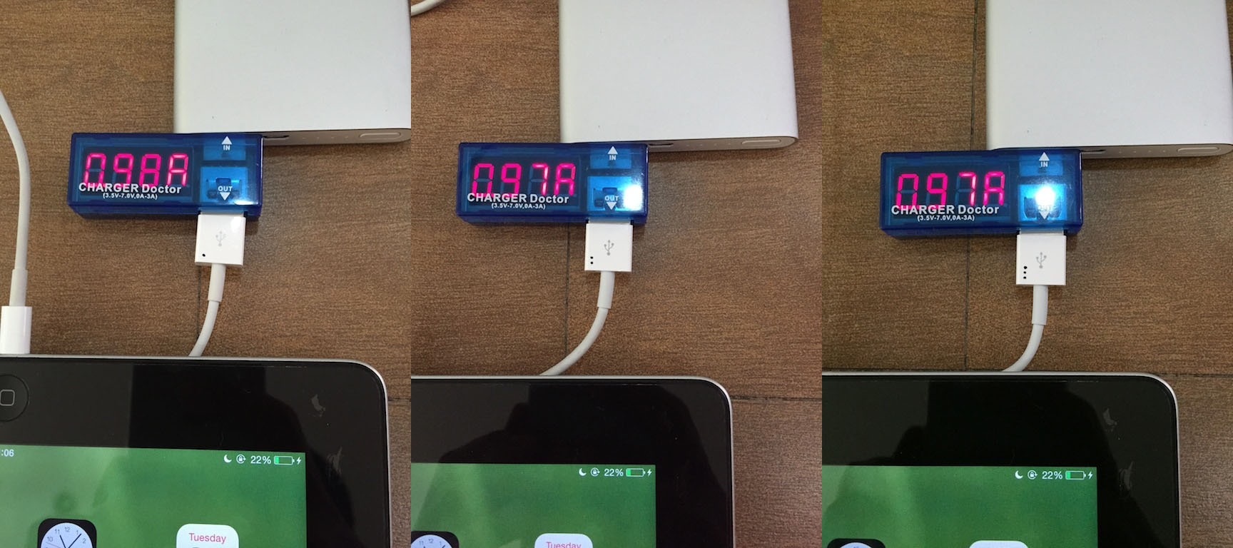 5) Also being curious of the performance of my microUSB-to-lightning adapter, I decided to to pull some test with some random USB to microUSB cables. The first one is the dumb cable with data pins being shorted. It's the best cable to charge the Xiaomi 16000mAh allowing 2.2A current draw from Samsung charger. However, it seems that the iPad detects and decided 1A is the max. The second cable is a fancy microUSB splitter cable, with one end being dumb cable and the other being regular data cable. The dumb cable end shows consistent 1A draw, while the data end allows charging with full speed.