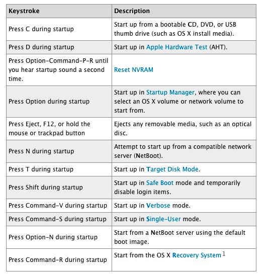 One other thing: For the special startup keys for OSX, you may find you have to hold down ALT or the WINDOWS key to do the same thing, since the keyboard mappings are not loaded during that time-frame.