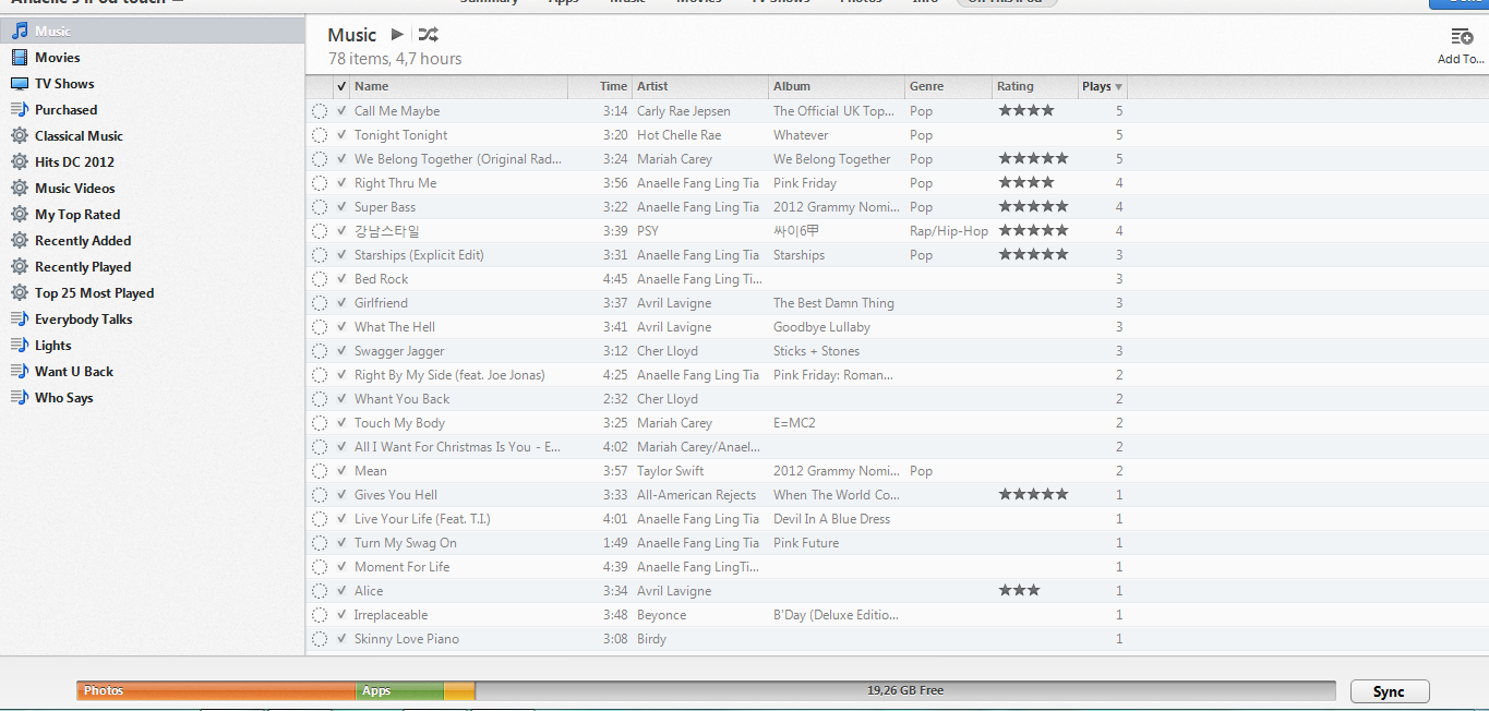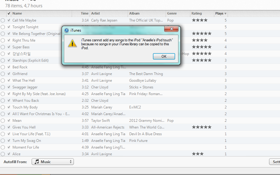 btw it says iTunes cannot add any song to the iPod "Anaelle's iPod Touch" because no song sin your iTunes Library can be copied to this iPod.