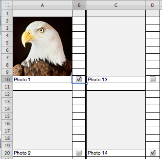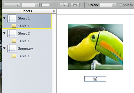 Here is a sample sheet with a photo in a rectangle (shape) and a single-celled table for a checkbox. Sheet 2 looks identical except it uses a different picture. In fact, all I did was duplicate this sheet, change the sheet name to "Sheet 2" and drag a different picture into it. The picture is the "fill" for the shape. You can drag another picture into the shape to replace what is there or you can set the fill to a color if there is no picture.