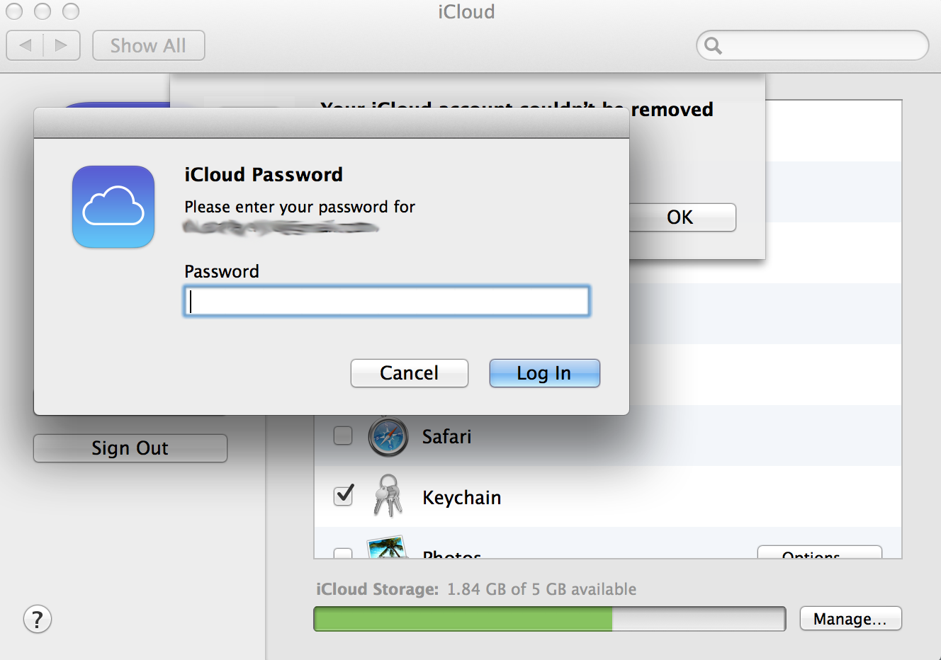 Seconds after, I was prompted to enter my password, but as you can see, the icloud window underneath shows that I was signed in...