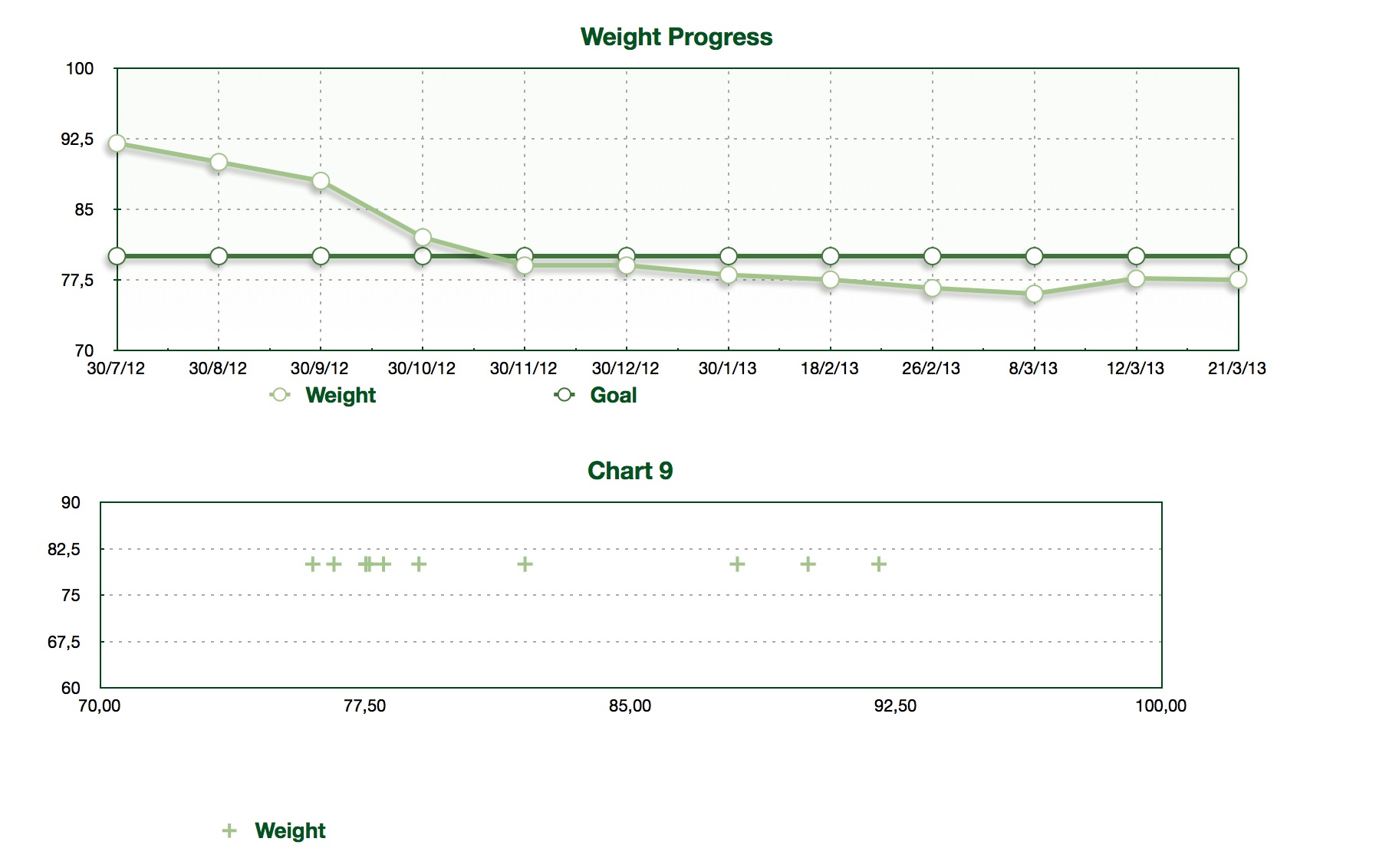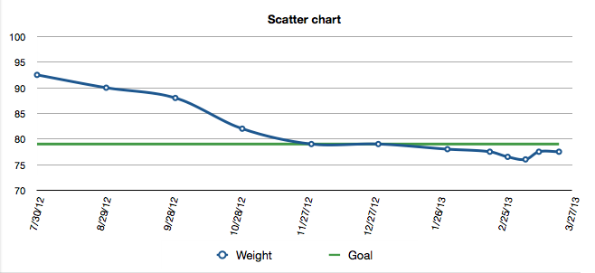 The Scatter chart uses default formatting with six exceptions: Data symbol for the Goal data series and number of steps on the Y axis were set as described above. The size of the data symbol for the Weight series was reduced from 10 points to 7. Both series were set to use a "curve" connector between data points. Stroke weight for both series' curve connectors was set to 3 points. The Date series labels were rotated to 75°, and the legend moved down to a position below the labels.