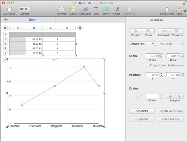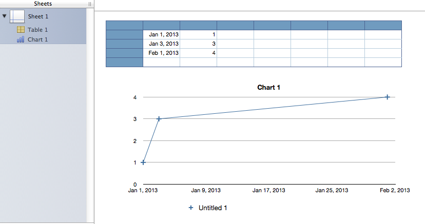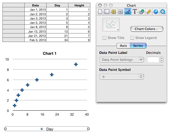These format changes were made in the Chart Inspector and the Metrics Inspector. Here's the scatter chart, expanded horizontally. I've increased the number of steps on the x-axis to 8.