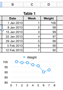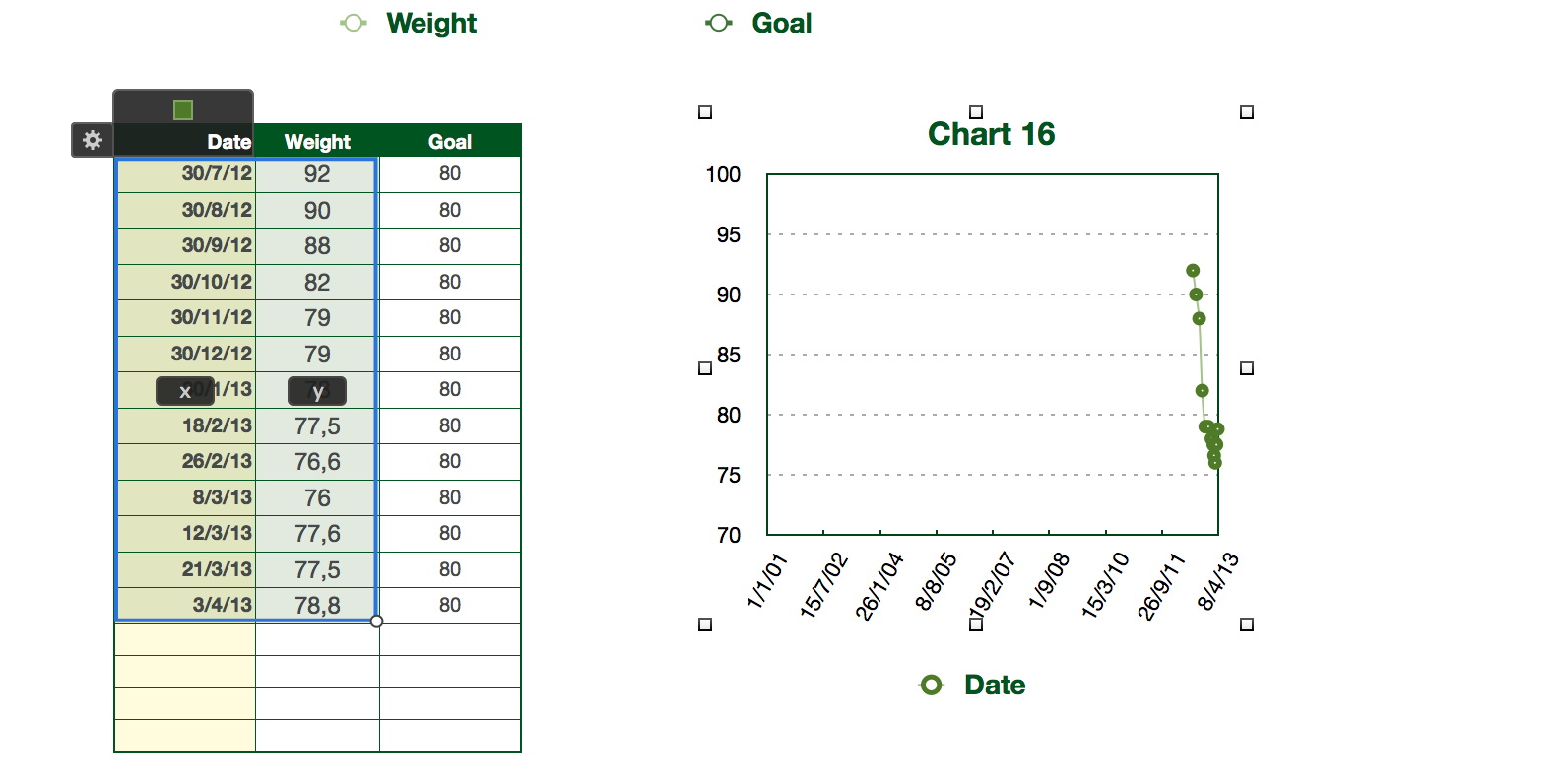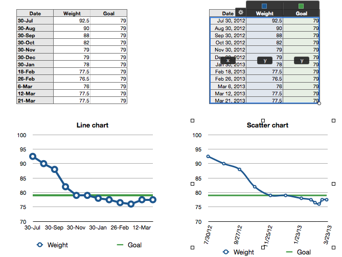 On the left is a Line chart, using data from the table on the left. In this table, the dates are in a Header Column. These are actual Date and Time values, identical to those in the second chart, but formatted to display only the day and month. Weight values are estimated from your similar chart above.