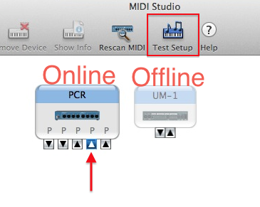 Third: With the USB Interface showing up as "Online", Enable Test Setup in AMS and play your MIDI Keyboard. You should see the Blue Triangle on the Interface in AMS flash, and you should hear a beep through the System audio: