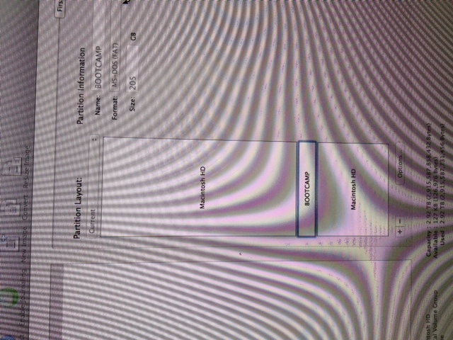Problem 2: I used Bootcamp to partition a 200GB (actually 205 becuase the stupid slider is so sensitive and it won't allow you to just type in the size you want). And off it ran. It took forever, so I went and watched TV. I then heard my computer restart. When I came back it was a black screen. I forced it to reboot with the power button. This brought up another black screen that stated the no boot volume, press a key statement. I again forced a reboot and held down option key which allowed me to choose my iMac hard drive. There was no option to choose a windows/bootcamp drive.