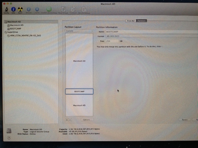 At this point, OS X had to do an internet recovery in order to get working again. OS X correctly stated that I had a 3.12 TB partition in Disk Utility. I ran Bootcamp Assistant and let it do its magic. I chose a 520 gb partition (same annoying slider issue as someone else mentioned, I really wanted to put in 512 gb but the slider would not land on that size).