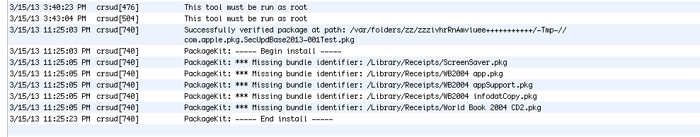 Startingcom.apple.softwareupdate.crsucrsud- Has to do with code signing and software update and trust evaluation in Lion. Mountain lion handles it different.