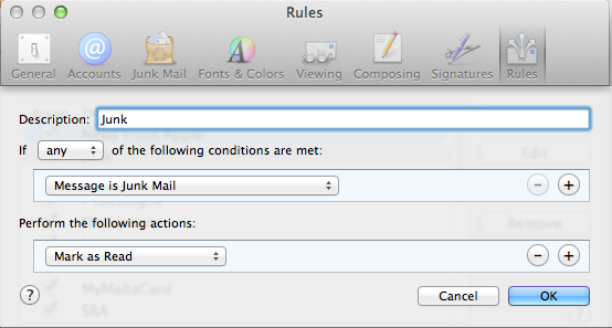 My GMAIL "Account's" Spam folder is the problem. This is not one of the options in the conditions drop-down box. You did give me the idea though to go see what I could do through gmail.com. I tried to see if I could change the rules of that folder to "Mark as Read" everything in it automatically, or even hide the fodler from IMAP, but it doesn't look like either of those options are available either.
